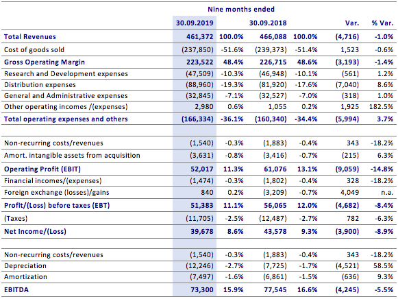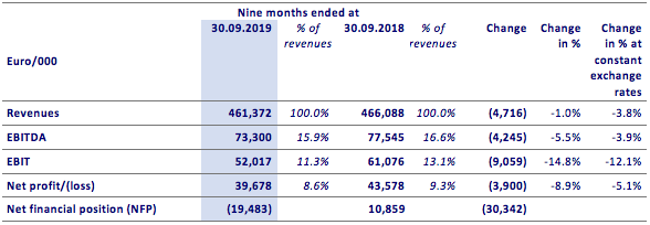 Net profit amounted to €39.7 million, equal to 8.6% of revenues, down by 8.9% (5.1% net of the exchange effect) in respect with the first nine months of 2018.
