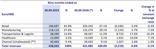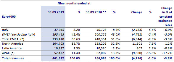 The table below shows Group revenue by geographic area, as achieved in the first nine months of 2019 versus the same period of 2018: