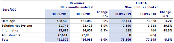 In the first nine months, the Informatics Division recorded revenues for €13.7 million, down by 6.3% on the first nine months of 2018. Divisional EBITDA was positive for €0.7 million (positive for €0.5 million in the same period of 2018).