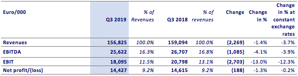 In the third quarter of 2019, revenues decreased by 1.4% to €156.8 million and EBITDA declined by 4.1% to €25.6 million, reducing the EBITDA margin to 16.3%, compared to 16.8% of the same period of 2018. At constant exchange rates, the EBITDA margin was in line with last year.