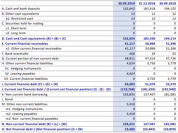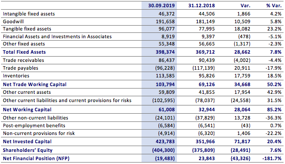 As of 30 September 2019, the Net Financial Position was negative for €19.5 million, with a decrease of respectively €30.3 million on 30 September 2018 (positive for €10.9 million) and €43.3 million on 31 December 2018 (positive for €23.8 million). Net of the application of the new accounting standard IFRS 16, which determined the recognition of right-of-use assets for €9.9 million and financial liabilities for €10.0 million, the net financial position decrease would have been €20.3 million on 30 September 2018 and €33.3 million on 31 December 2018. The change as compared with 30 September 2018 is mainly due to the higher investments for approximately €7.1 million and to working capital trend.