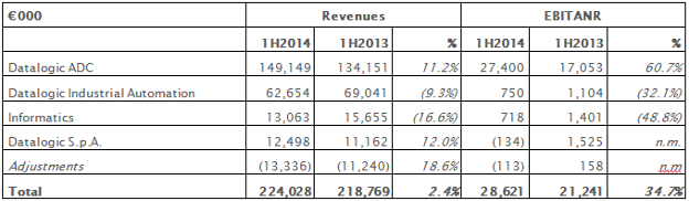 PERFORMANCE BY DIVISION The following table shows individual operating divisions’ sales (inclusive of intersegment revenues) and EBITANR (earnings before interest, acquisition amortization and non-recurring items) for the first half of 2014 for the individual Operating Divisions. The ADC Division (Automatic Data Capture), specialized in the design and production of fixed retail scanners, professional handheld readers and mobile computers, registered revenues of 149.1 million Euro, up +11.2% compared to 134.2 million Euro in the first half 2013. This division has benefited from a positive trend across all the business lines, due to the launch of highly innovative products in the retail segment and throughout all the geographical regions. This has occurred thanks to a closer management of the territory and a new channel programme.