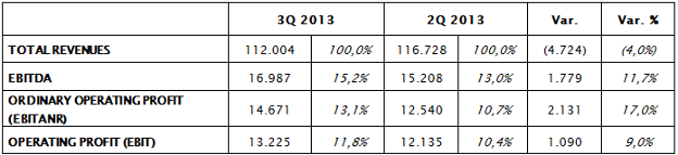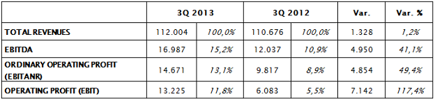• 9M2013 closes with a net profit of 17.7 million Euro compared to 28.6 million Euro registered in the first nine months of 2012