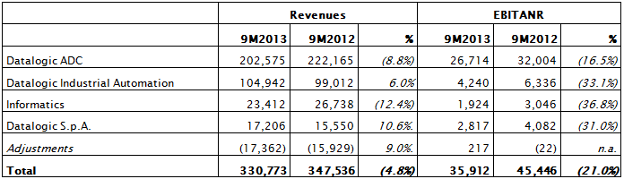 The ADC Division (Automatic Data Capture) specialized in the design and production of fixed retail scanners, professional handheld readers and mobile computers, registered revenues of 202.6 million Euro (222 million Euro in the same period of 2012). This division, in particular, is susceptible to the seasonal effect which is typical of the third quarter of the year and the macroeconomic "wait and see" trend of the retail sector that tends to postpone investments.