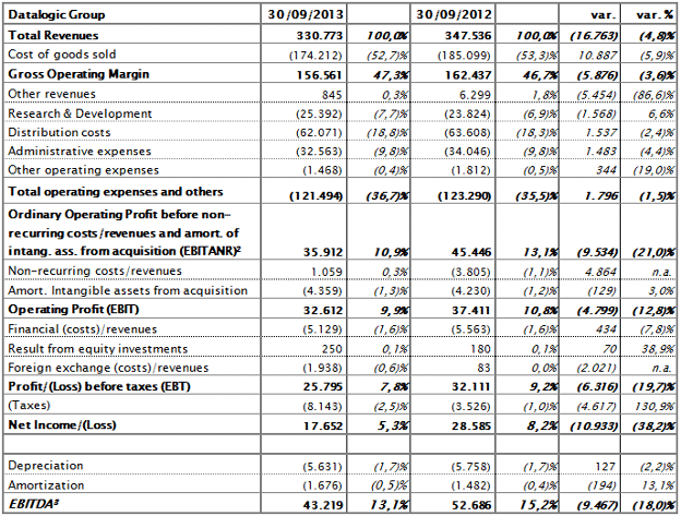 Sales revenues for the first nine months of 2013 came in at 330.8 million Euro compared to 347.5 million Euro of the first nine months of 2013 (-4.8% y/y and -3.5% at constant Euro/Dollar exchange rate).