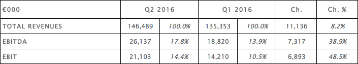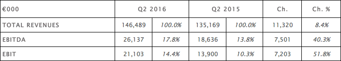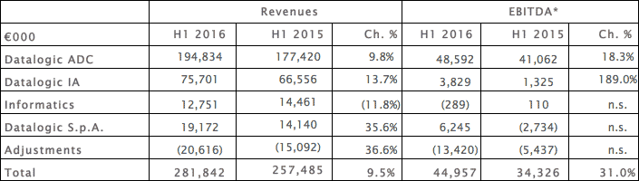 Bologna, 4th August 2016 - Datalogic S.p.A. (Borsa Italiana S.p.A.: DAL), a company listed in the STAR Segment of the Italian Stock Exchange managed by Borsa Italiana S.p.A. (“Datalogic”), a global leader in Automatic Data Capture and Industrial Automation markets, and world-class producer of bar code readers, mobile computers, sensors for detection, measurement and safety, vision systems and laser marking equipment, approved today the Half-Year Report at 30th June 2016. The first half of the year saw substantial increases in all financial indicators, confirming the positive performance of the first quarter. Thanks to a substantial growth in sales revenues, EBITDA was up by 31% to approximately €45 million, EBIT by over 43% to €35.3 million and net profit by 22% to €26.2 million. The Chairman and CEO of the Datalogic Group, Romano Volta, commented: “The results of the first half of the year show a very positive performance for the entire Group. Both divisions reported revenue growth above the market average thanks to constant product innovation, which has allowed us to offer highly innovative solutions to our clients and partners, and thanks to the investments we have made in our distribution network. In particular, I want to highlight the excellent results obtained in the North American market and in Europe. The performance in terms of profits was also very positive, with Group EBITDA margin reaching 16% - the highest level in the last ten years – which benefited in the first half from some control actions of operating costs and the shift of some R&D expenses. This performance, supported by increased booking and the ongoing optimisation of production and operating costs, makes us confident that positive results will also be achieved in the second half of the year.” Reflecting the favourable performance of the two divisions over the period, sales revenues reached €281.8 million, with a 9.5% increase compared to the €257.5 million recorded in the first half of 2015 (same percentage in the analysis at constant Euro/USD exchange rates). The booking reached €288.2 million, up by 7.2% on the same period in 2015. The incidence on revenues generated by new products was 27.4% in the second quarter, basically in line with the positive trend of the first quarter (27.6%) and up with respect to the same period of 2015 (26.4%). Gross Operating Margin was €131 million, up by 7.9% with respect to €121.4 million in the same period of previous year (the same percentage at constant Euro/USD exchange rates). As a percentage of revenues, Gross Operating Margin went from 47.2% in 2015 to 46.5% in 2016. This decrease is mainly due to a different mix of products sold. The increase in Operating costs was less than 1%, to €94.9 million from €94.3 million in the first half of 2015. As a percentage of sales, operating costs were 33.7%, a considerable improvement with respect to the first half of 2015, when the ratio was 36.6%. This positive performance was the result of initiatives aimed at reducing general and administrative expenses, which were down by 5.8%. Research and Development costs increased by 3.7% to 24.3 million, 8.6% as a percentage of revenues, lower than in the same period of the previous year as a result of a rescheduling. EBITDA increased significantly, by 31%, from €34.3 million to €45 million (+31.1% at constant Euro/USD exchange rates), while as a percentage of revenues (EBITDA margin) it rose to 16% compared to 13.3%, and was not impacted by the Euro/USD exchange rate. EBIT increased by 43.1%, from €24.7 million to €35.3 million (+43.2% at constant Euro/USD exchange rates). After financial expenses of €1.9 million, down from €3.2 million in the first half of 2015, as a result of the new loan agreement obtained on February 2015 from a “pool” of banks, and exchange rate losses of €0.3 million compared to €3.4 million profits in the first half of 2015, Group net profit reached €26.2 million, up by 22% compared to the €21.5 million recorded in the first half of 2015. Net financial debt as at 30th June 2016 was €27.5 million, compared to €21.0 million as at 31st December 2015, and €58.4 million as at 30th June 2015. Trade working capital as at 30th June 2016 was €56.1 million, compared to €36.5 million as at 31st December 2015, and €54 million as at 30th June 2015. The increase with respect to December is mainly due to a regular increase in inventories in the first half of the year. THREE-MONTH PERFORMANCE Sales revenues in the second quarter of 2016 were €146.5 million, up by 8.4% compared to the second quarter of 2015 (+9.4% at constant Euro/USD exchange rates) and 8.2% compared to the first quarter of 2016. The booking in the quarter – the orders already acquired – was €147.7 million, up by 17.5% compared to the second quarter of 2015. Operating margins increased significantly both compared to the second quarter of 2015 and to the first quarter of the current year. Q2 2016 vs. Q2 2015