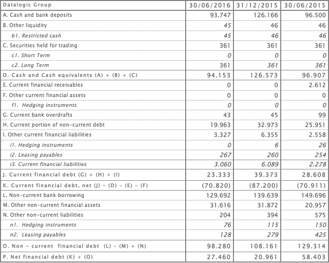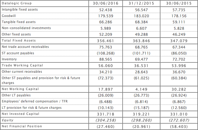 *** Please note that the half-year report at 30th June 2016 will be available to anyone who requests it at the company headquarters, at the offices of Borsa Italiana S.p.A. (www.borsaitaliana.it), on the “Storage” instrument, managed by BIt Market Services and may also available on the company’s website www.datalogic.com (Investor Relations section).The manager responsible for preparing the company’s financial reports – Stefano Biordi – declares, pursuant to paragraph 2 of Art. 154-bis of the “Testo Unico della Finanza”, that the accounting information contained in this press release corresponds to the document results, books and accounting records. Reclassified income statement at 30th June 2016 – Euro/1.000
