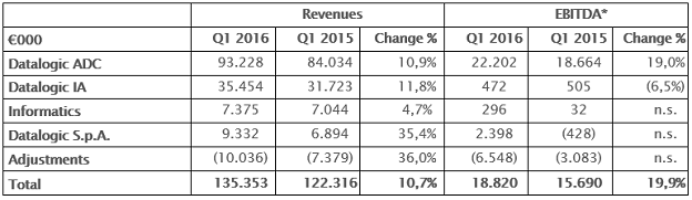 Bologna, 13th May 2016 – Datalogic S.p.A. (Borsa Italiana S.p.A.: DAL), a company listed in the STAR Segment of the Italian Stock Exchange managed by Borsa Italiana S.p.A. (“Datalogic”), a global leader in Automatic Data Capture and Industrial Automation markets, and world-class producer of bar code readers, mobile computers, sensors for detection, measurement and safety, vision systems and laser marking equipment, approved today the Quarterly Financial Report at 31st March 2016.