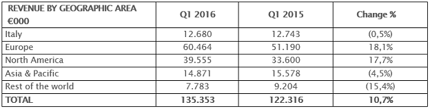 • Sales revenues up 10.7% at 135.4 million Euro compared to 122.3 million Euro in the first quarter of 2015 (+9.6% net of Euro/Dollar exchange rate effect)
