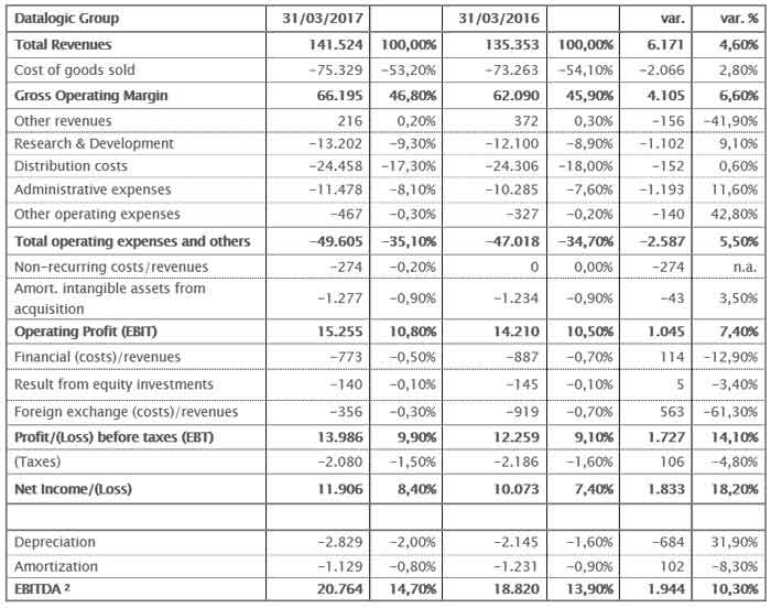 [1] EBITDA (gross operating margin) is an economic indicator which is not defined in the IFRSs, but is used by the management of the company to monitor and assess its economic performance, as it is not influenced by the volatility which is due to the various criteria used to determine the taxable income, amounts and characteristics of the capital employed and the relative amortization/depreciation policies implemented. Datalogic defines this indicator as the profit/loss for the period, gross of amortisation of intangible and depreciation of tangible assets, non-recurring costs, financial income and expenses and income tax.