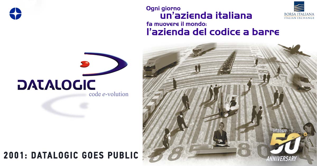 In 2001 Datalogic went public, listed at the Milan Stock Exchange. This event represented the point of arrival of the courageous managerial reorganization wanted by Dr. Romano Volta in 1993 as well as the new starting point and the drive for the company’s future growth and development. To mark the great discontinuity and the true multinational character of the company, Datalogic’s logo was changed with the adoption of a new color, now called “Datalogic blue”. The new payoff is equally indicative: “Code e-volution”.