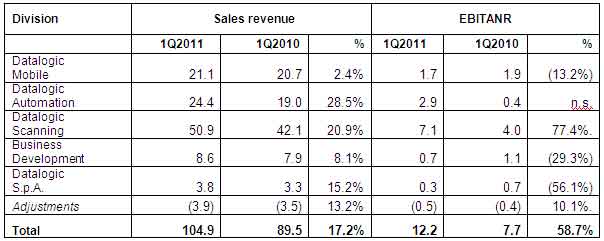 | • The first quarter confirms a sustained growth of sales revenue: 105 million Euros, +17% compared to the same period in 2010 • Strong growth in EBITDA to 14.9 million Euros, +40.7% vs. 1Q10 and with an EBITDA margin at 14.2% • Net profit of 5.7 million Euros, +37% versus 1Q10 • Improved net financial debt to €71.2 million Euros Bologna, 10th May 2011 – The Board of Directors of Datalogic S.p.A. (Borsa Italiana S.p.A.: DAL), a company listed in the Star segment of Italy’s stock exchange (MTA) organised and managed by Borsa Italiana SpA (“Datalogic”) and market leader in barcode readers, data collection mobile computers, RFID and vision systems, today approved the interim financial statements for the quarter ending on 31st March 2011. The first quarter of 2011 closed with a consolidated net profit of 5.7 million Euros, up by 37% vs. 4.1 million recorded in the first quarter of 2010. Mauro Sacchetto, CEO of Datalogic, commented: “FY2011 opened with strong growth results compared to the previous year and the last quarter both in terms of turnover and profitability, validating the excellent performance of 2010. The first quarter showed a positive trend in all divisions confirming a higher growth compared to reference markets. Work on the costs structure, started in previous years, has allowed further efficiency gains thereby ensuring the achievement of a margin closer to our target for the end of the Business Plan period 2010-2012. Even though the macroeconomic recovery remains uncertain, we look to the future with confidence and thanks to market leadership and continued product innovation, we are confident of strengthening the growth process already begun.” Sales revenue reached 105 million Euros, representing a 17.2% growth compared to the first quarter of 2010 and a 3% rise compared to the fourth quarter of 2010, thanks to commercial strategy and continuous product innovation. At constant Euro/Dollar exchange rates, the increase versus the previous year would have been slightly lower at 16.7%. EBITDA rose to 14.9 million Euros, with a strong growth of 40.7% compared to 10.6 million Euros in the first quarter of 2010 and to 10.9 million Euros reported in the fourth quarter of 2010, confirming the continuous progression of results and a relevant growth of profitability (EBITDA margin at 14.2% compared with 11.8% in the first quarter of 2010). This positive trend has been reached thanks to the reduction of operating costs, equal to 37.6 million Euros (up 13.6% in the first quarter of 2010 and down by 3% in comparison to last quarter). Research and Development costs totalled 6.8 million Euros, equivalent to 6.5% of revenue. Even more relevant was the growth in EBITANR[1] which amounted to 12.2 million Euros (7.7 million in the first quarter of 2010 and 7.9 million in the last quarter of 2010). After financial charges substantially stable at 1.5 million Euros, compared to 1.4 million in the first quarter of 2010 and foreign exchange losses at 1.5 million compared to a foreign exchange profit of 0.9 million Euros in the first quarter of 2010, net profit grew to 5.7 million, compared with 4.1 million in the first quarter of previous year. Net financial debt at 31st March 2011 was 71.2 million Euros, a significant improvement compared to 76.5 million recorded at 31st December 2010. Net working capital amounted to 32.7 million Euros at 31st March 2011, increasing by 5.5 million versus 27.2 million at 31st December 2010. ![]() All of the Group’s divisions have registered growth compared to the first quarter of the previous financial year; in particular, the Scanning and Automation Divisions have continued to show a very positive trend in the first three months of this year. The Datalogic Automation Division, which specializes in the production of barcode, RFID and vision automatic identification systems, recorded in the quarter revenues of 24.4 million Euros up 28.5%. The Datalogic Scanning Division, specialized in the production of bar code readers for the retail market and hand held scanners, posted a 21% increase in revenues, to 50.9 million Euros. Datalogic Mobile, specialized in the production of mobile computers for professional use, closed the quarter with a sales revenue of 21.1 million Euros up 2.4%, while the Business Development Division (which includes Informatics Inc. and Evolution Robotics Retail Inc.) recorded growth of +8.1% with sales of 8.6 million Euros. The following table shows individual operating divisions’ sales (inclusive of intersegment revenues) and EBITANR (earnings before interest, acquisition amortization and non-recurring items) by segment for the first three months of 2011. In particular, the Scanning and Automation Divisions showed a strong growth in EBITANR. ![]() As to the geographical areas, in the first quarter of 2011 the emerging markets in Asia recorded a significant growth in sales with an increase of 46% at 14 million Euros compared to 9.7 million Euros of the same period last year. The quarter showed good recovery of the Italian market, up 21% from 9.1 million Euros to 11 million Euros, followed by North America, up 18% from 25 million Euros to 29.4 million Euros and Europe, up 13% from 37.9 million Euros to 42.9 million Euros. Please note that the Interim Management Statement at 31st March 2011 is not audited and that it is available in the Investor Relations section of the company’s website: www.datalogic.com. The manager responsible for preparing the company’s financial reports - Dott. Marco Rondelli – declares, pursuant to paragraph 2 of Art. 154-bis of the “Testo Unico della Finanza”, that the accounting information contained in this press release corresponds to the document results, books and accounting records. [1] EBITANR – Earnings before interest, taxes, acquisition and non recurring |