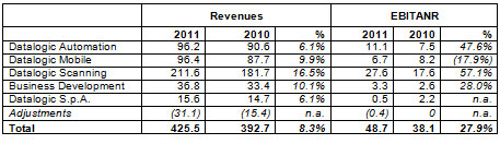 Datalogic Scanning - specialized in fixed barcode readers for the retail market and handheld scanners, accounting for nearly 50% of consolidated revenue - grew by 16.5%, with total revenue of €211.6 million (€56.9 million in the fourth quarter of 2011, up 31% on an annual basis).