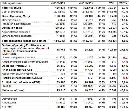 EBITDA rose to €59.2 million, up 19%, compared to €49.8 million in 2010, and with an EBITDA margin at 13.9%, compared to 12.7% in the previous year. This result included operating costs for €150.2 million, reflecting an increase of 4.9% on the €143.2 million for 2010.