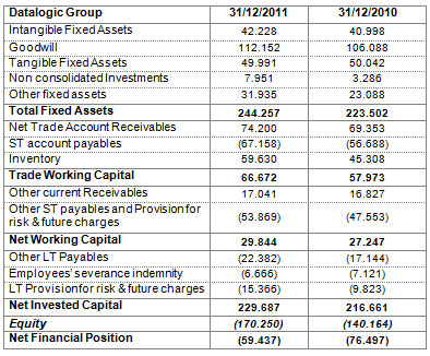 Net financial debt at 31 December 2011 was €59.4 million, showing an improvement compared to €76.5 million at 31 December 2010, thanks to the significant cash flows generated during the year and despite the acquisition of PPT Vision, which took place in December and involved a cash outlay of €4.1 million. In particular, attention is called to the substantial cash flows from operating activities, amounting to €68.5 million, derived from the good EBITDA level.