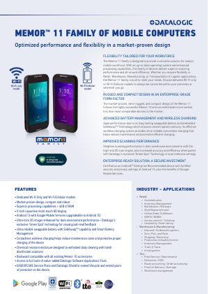 Meet the Memor 11 family: a complete set of handheld computers designed to provide a flexible and versatile solution for today’s mobile workforce. With an up-to-date operating system and enhanced processing capabilities, this family of devices delivers superior scanning performance and all-around efficiency. Choose between Wi-Fi only or Wi-Fi/Cellular models to fully meet the needs of Retail, Warehouse, Manufacturing, Transportation & Logistics, and Healthcare applications. Unlock limitless possibilities with Memor 11!