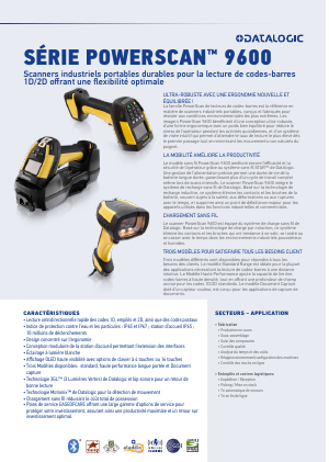 La série 9600 est le premier scanner industriel à combiner la lecture de codes-barres haute performance et la RFID UHF dans un seul appareil robuste et sans fil. Conçue pour améliorer l’efficacité dans les secteurs du commerce de détail, du transport et de la logistique, de l’industrie et de la santé, elle est disponible en deux versions sans fil : un modèle standard et un modèle « document capture » avec double caméra, écran OLED et clavier à 16 touches.