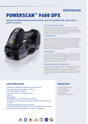 La série 9600 est maintenant disponible dans une gamme complète de modèles industriels DPX pour les codes DPM et les codes sur étiquettes. La gamme 9600 DPX cible principalement les applications de traçabilité dans l'automobile, l'aérospatiale, les pneus et l'électronique. Elle peut être également utilisée dans le domaine de la santé pour le suivi des dispositifs médicaux dans les hôpitaux. Elle comprend un modèle filaire (PD9600 DPX), un modèle sans fil équipé de la radio STAR 433 MHz Cordless System™ 2.0 de Datalogic (PM9600-D DPX) avec des options complètes de clavier/affichage, et un modèle sans fil Bluetooth® 5.0 (PBT9600 DPX).