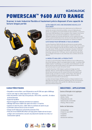 La série 9600 est également disponible dans une suite complète de produits Auto Range (AR) afin de fournir la meilleure solution pour différents besoins. Elle comprend des modèles filaires (PD9600 AR), des modèles sans fil dotés du radio STAR 433 MHz Cordless System™ 2.0 de Datalogic (PM9600 AR) et d'options complètes de clavier/affichage, ainsi que des modèles sans fil Bluetooth® 5.0 (PBT9600AR).