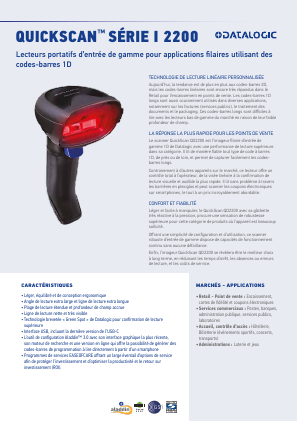 Le lecteur de codes-barres 1D QuickScan 2200 Series est le lecteur de codes-barres filaire d'entrée de gamme offrant des performances de lecture optimales « dès la première fois, à chaque fois ». Facile à configurer et à utiliser, ce lecteur de codes-barres 1D extra-robuste est léger et bien équilibré pour un fonctionnement sans interruption et sans problème. Il est confortable dans la main et pour les yeux de l'opérateur, avec une luminosité douce et réglable. Le lecteur de codes à barres 1D QuickScan 2200 s'avérera être le meilleur choix à long terme en réduisant les temps d'arrêt, les temps de gestion des codes non lus et mal lus et les coûts d'entretien. Le lecteur QuickScan 2200 sera amorti en moins de deux mois !
