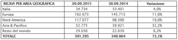 I ricavi di vendita si attestano a 391,3 milioni di Euro, con una crescita del 15,1% rispetto ai 340,1 milioni di Euro dei primi nove mesi del 2014 (+5,2% a cambi costanti). Il booking ha raggiunto 405,2 milioni di Euro, in crescita del 16,3% rispetto allo stesso periodo del 2014.
