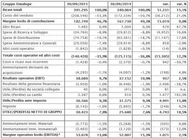 Bologna, 5 novembre 2015 – Il Consiglio di Amministrazione di Datalogic S.p.A. (Borsa Italiana S.p.A.: DAL), società quotata presso il Mercato Telematico Azionario – Segmento Star – organizzato e gestito da Borsa Italiana S.p.A. (“Datalogic”) e leader mondiale nei mercati dell’acquisizione automatica dei dati e dell’automazione industriale e produttore di lettori di codici a barre, mobile computer per la raccolta dati, sensori, sistemi di visione e sistemi di marcatura laser, ha approvato il resoconto intermedio di gestione al 30 settembre 2015.