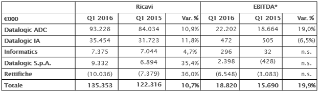 La Divisione Industrial Automation specializzata nella produzione di sistemi di identificazione automatica, sicurezza, rilevazione e marcatura per il mercato dell’Automazione Industriale, ha registrato un fatturato di 35,5 milioni di Euro, evidenziando una crescita dell’11,8% rispetto al primo trimestre 2015 (+10,9% a cambi costanti). Al netto dei risultati della Business Unit Systems, che beneficia dell' ordini di Ryal Mail e di nuovi altri clienti nel segmento postale e retail, i ricavi della divisione sono aumentati del 6,5% a 30,7 milioni di Euro (+5,9% a cambi costanti). L’EBITDA è pari a 0,5 milioni di Euro (EBITDA Margin pari a 1,3%) sostanzialmente in linea rispetto al primo trimestre dell’esercizio precedente. La marginalità risente di alcuni ritardi nelle azioni di recupero dell’efficienza produttiva e di costi aggiuntivi relativi al nuovo impianto produttivo in Ungheria, la cui attività è partita nel mese di Aprile 2016 e i cui effetti si dispiegheranno nel corso dell’esercizio.
