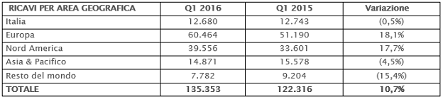 In merito alle aree geografiche, nel primo trimestre 2016, si è evidenziato un andamento positivo del mercato europeo con una crescita del 18,1%, a 60,5 milioni di Euro. Molto positivo l’andamento delle vendite nel mercato nord Americano (+17,7% a 39,6 milioni di Euro) principalmente nell’ambito del segmento Retail.