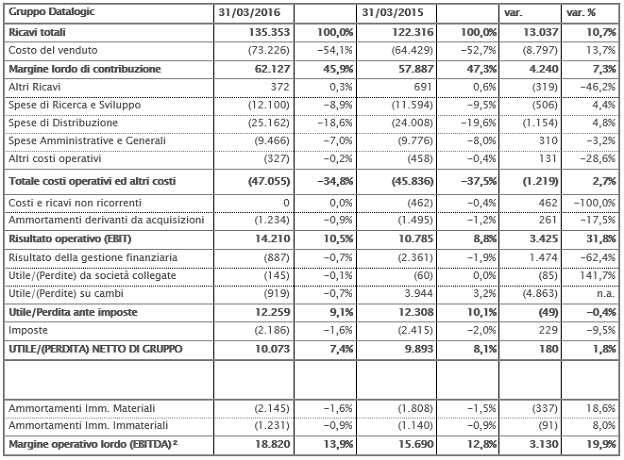 Bologna, 13 maggio 2016 – Il Consiglio di Amministrazione di Datalogic S.p.A. (Borsa Italiana S.p.A.: DAL), società quotata presso il Mercato Telematico Azionario – Segmento Star – organizzato e gestito da Borsa Italiana S.p.A. (“Datalogic”) e leader mondiale nei settori dell’acquisizione automatica dei dati e dell’automazione industriale e produttore di lettori di codici a barre, mobile computer, sensori per la rilevazione, misura e sicurezza, sistemi di visione e marcatura laser, ha approvato in data odierna il resoconto intermedio di gestione al 31 marzo 2016.
