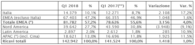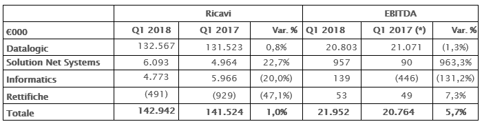 La Divisione Datalogic ha registrato, nel primo trimestre, un fatturato di 132,6 milioni di Euro in crescita dello 0,8% rispetto allo stesso periodo del 2017 (+6,8% a cambi costanti), con un andamento positivo in EMEA, Latin America e APAC, in particolare in Cina e Corea dove si è registrata una crescita di oltre il 15% (+25,9% a cambi costanti). L’EBITDA della divisione è pari a 20,8 milioni di Euro ed è diminuito dell’1,3% con un’incidenza sul fatturato pari al 15,7% (16,0% al 31 marzo 2017), tale decremento è riconducibile ai maggiori investimenti in Ricerca e Sviluppo ed all’aumento delle Spese di Distribuzione per l’avvio del piano di sviluppo commerciale, in linea con la strategia del Gruppo.