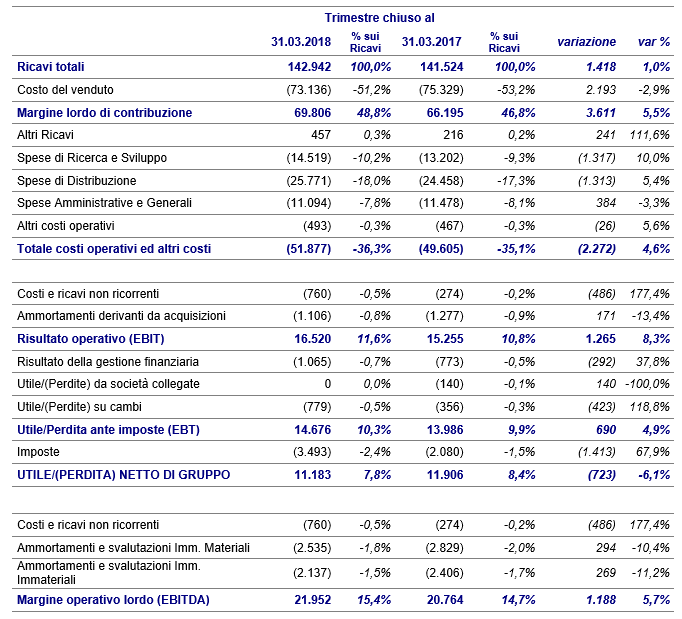 RICAVI A 142,9 MILIONI DI EURO EBITDA A 22,0 MILIONI DI EURO, PARI AL 15,4% DEI RICAVI UTILE NETTO A 11,2 MILIONI DI EURO, PARI AL 7,8% DEI RICAVI POSIZIONE FINANZIARIA NETTA POSITIVA A 32,3 MILIONI DI EURO • Ricavi a 142,9 milioni di Euro in crescita dell’1,0% (+7,8% a cambi costanti) rispetto a 141,5 milioni di Euro al primo trimestre 2017. • EBITDA[1] a 22 milioni di Euro in aumento del 5,7% rispetto a 20,8 milioni di Euro al primo trimestre 2017; EBITDA margin in crescita dal 14,7% al 15,4%. • Utile netto a 11,2 milioni di Euro rispetto a 11,9 milioni di Euro al primo trimestre 2017. • Ulteriore miglioramento della Posizione Finanziaria Netta positiva a 32,3 milioni di Euro rispetto a 30,1 milioni di Euro al 31 dicembre 2017. Bologna, 9 maggio 2018 - Il Consiglio di Amministrazione di Datalogic S.p.A. (Borsa Italiana S.p.A.: DAL), società quotata presso il Mercato Telematico Azionario – Segmento Star – organizzato e gestito da Borsa Italiana S.p.A. (“Datalogic”) e leader mondiale nei settori dell’acquisizione automatica dei dati e dell’automazione industriale, ha approvato in data odierna il resoconto intermedio di gestione al 31 marzo 2018.
