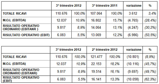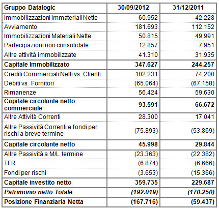 Nota: A seguito dell’introduzione dei principi IAS, nei prospetti di bilancio i componenti straordinari non sono più evidenziati separatamente ma inclusi nella gestione ordinaria. Al fine di garantire una migliore rappresentazione della profittabilità ordinaria del Gruppo, si è preferito esprimere un risultato operativo al lordo dei costi/ricavi non ricorrenti e degli ammortamenti derivanti da acquisizioni, definito “Risultato operativo ordinario prima dei costi e ricavi non ricorrenti e degli ammortamenti derivanti da acquisizioni (EBITANR - Earnings before interest, taxes, acquisition and non recurring)” indicato con il termine “Risultato operativo ordinario”. Per consentire la comparabilità rispetto ai prospetti di bilancio viene comunque fornito un ulteriore margine di profittabilità intermedio (definito come “Risultato operativo”) che include i costi/ricavi non ricorrenti e gli ammortamenti derivanti da acquisizioni che corrisponde a quanto esposto nello schema di Bilancio. [1] EBITANR – Earnings before interest, taxes, acquisition and non recurring – Risultato operativo ordinario prima dei costi e ricavi non ricorrenti e degli ammortamenti derivanti da acquisizioni. Stato Patrimoniale Riclassificato al 30 settembre 2012 – Euro/1.000