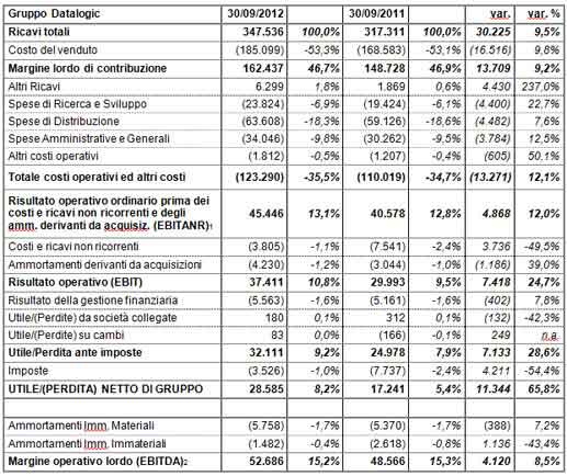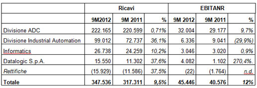 • Ricavi di vendita in crescita del 9,5% a 347,5 milioni di Euro rispetto a 317,3 milioni di Euro registrati nei primi nove mesi del 2011 Bologna, 12 novembre 2012 – Il Consiglio di Amministrazione Datalogic S.p.A. (Borsa Italiana S.p.A.: DAL), società quotata presso il Mercato Telematico Azionario – Segmento Star – organizzato e gestito da Borsa Italiana S.p.A. (“Datalogic”) e leader mondiale nell’identificazione automatica e uno dei principali fornitori di soluzioni globali e produttore di lettori di codici a barre, di mobile computer per la raccolta dati, e di sistemi di visione, ha approvato in data odierna il Resoconto intermedio di gestione al 30 settembre 2012. I risultati del trimestre evidenziano un andamento riflessivo delle attività legato alla crisi macroeconomica globale. I primi nove mesi dell’anno, che consolidano Accu-Sort Systems (dal 20 gennaio 2012) e PPT Vision, si chiudono con un utile netto di 28,6 milioni di Euro rispetto ai 17,2 milioni di Euro registrati nei primi nove mesi del 2011. L’Amministratore Delegato del Gruppo Datalogic, Mauro Sacchetto, ha così commentato: “Il trimestre appena concluso è stato ancora influenzato dalla crisi economico-finanziaria internazionale in atto che ha comportato un rallentamento delle economie di molti Paesi occidentali, con ripercussioni sulle vendite di Datalogic e dei nostri principali competitors. Nonostante questo scenario, Datalogic è riuscita a registrare un miglioramento, rispetto ai primi nove mesi del 2011, sui principali indici sia in valore assoluto che in termini di incidenza percentuale sui ricavi di vendita ed a performare meglio del mercato. L’andamento in crescita degli ordini per il trimestre in corso e le evidenze del mese di ottobre ci rendono fiduciosi per un’evoluzione positiva dell’esercizio in linea con gli obiettivi definiti”. I ricavi di vendita consolidati dei primi nove mesi si attestano a 347,5 milioni di Euro con un incremento del 9,5% rispetto ai 317,3 milioni di Euro dello stesso periodo dell’anno precedente. A cambi Euro/Dollaro costanti l’aumento rispetto all’esercizio precedente sarebbe stato pari al 4,5%. Tali risultati includono i ricavi relativi a Accu-Sort Systems e PPT Vision, entrambe integrate in Datalogic Automation a partire dal primo luglio 2012, per un totale di 27,9 milioni di Euro. Il Margine Operativo Lordo (EBITDA) del Gruppo è salito a 52,7 milioni di Euro dai 48,6 milioni di Euro dei primi nove mesi del 2011 mentre la sua incidenza sui ricavi (EBITDA margin) è pari al 15,2% in linea con l’esercizio precedente. La marginalità ha iniziato a beneficiare degli effetti della nuova Supply Chain del segmento ADC, realizzata nel corso del 2011. L’EBITANR raggiunge i 45,4 milioni di Euro rispetto i 40,6 milioni di Euro dei primi nove mesi del 2011. I nove mesi hanno evidenziato costi non ricorrenti per 3,8 milioni di Euro relativi alle attività di riorganizzazione interne al Gruppo, inerenti al processo di integrazione delle due società PPT Vision ed Accu-Sort Systems ed al riassetto della struttura di vendita della divisione Automatic Data Capture (ADC). Dopo oneri finanziari per 5,6 milioni di Euro rispetto ai 5,2 milioni di Euro dei primi nove mesi 2011 l’utile netto di Gruppo cresce a 28,6 milioni di Euro rispetto ai 17,2 milioni di Euro realizzati nei primi nove mesi del 2011. La posizione finanziaria netta al 30 settembre 2012 risulta negativa per 167,7 milioni di Euro rispetto ai 59,4 milioni di Euro al 31 dicembre 2011 ed è in miglioramento rispetto al 30 giugno 2012, pari a 171,8 milioni di Euro grazie alla continua generazione di cassa. L’aumento rispetto alla fine del 2011 è ascrivibile quasi interamente all’acquisizione di Accu-Sort Systems avvenuta nel mese di gennaio per un importo pari a 100,3 milioni di Euro. Il capitale circolante netto è pari a 46 milioni di Euro al 30 settembre 2012 in aumento rispetto ai 29,8 milioni di Euro al 31 dicembre 2011. A livello trimestrale, i ricavi di vendita sono cresciuti a 110,7 milioni di Euro (+3,4% sul terzo trimestre 2011 e -8,9% rispetto al trimestre precedente). Tale andamento riflessivo è causato principalmente da un rallentamento del mercato globale e dal posticipo di alcuni progetti di rilevanti dimensioni. Il rallentamento di fatturato si è riflesso sulla marginalità del trimestre a causa della maggiore incidenza dei costi fissi rispetto ai volumi di vendita. L’EBITDA si attesta quindi a 12 milioni di Euro rispetto ai 16,8 milioni di Euro del terzo trimestre 2011, con una marginalità dell’11% circa.