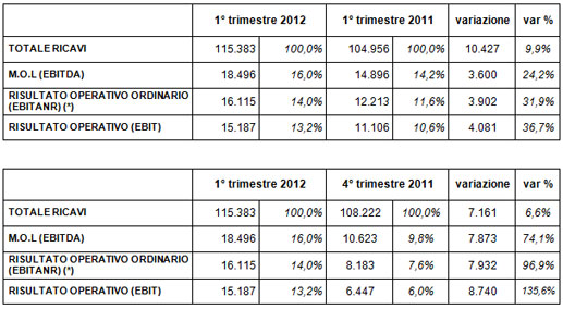 • EBITDA a 18,5 milioni di Euro, +24,2% rispetto al primo trimestre 2011; EBITDA margin in crescita dal 14,2% al 16%