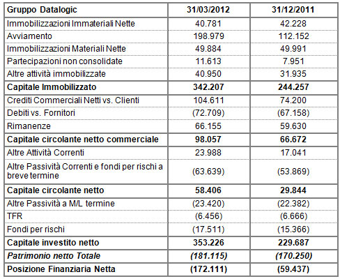 Il capitale circolante netto è pari a 58,4 milioni di Euro al 31 marzo 2012 in aumento di 28,6 milioni di Euro rispetto al 31 dicembre 2011 (pari a 29,8 milioni di Euro).