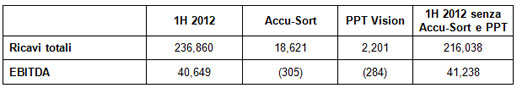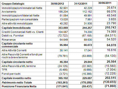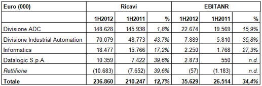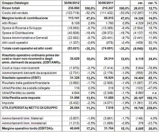 EVENTI NEL SEMESTRE Da gennaio 2012 è operativa la nuova Divisione ADC. Il 20 gennaio 2012 è stata perfezionata l’acquisizione della società Accu-Sort Systems Inc. e delle sue controllate. Accu-Sort, con sede a Telford in Pennsylvania, annovera circa 80 brevetti, di cui 57 registrati negli Stati Uniti, 250 dipendenti, uno stabilimento produttivo, due centri di ricerca, uno in Europa ed uno in USA, e 8 uffici commerciali. EVENTI SUCCESSIVI ALLA CHIUSURA DEL SEMESTRE Dal primo di luglio 2012 è operativa l’integrazione delle società Datalogic Automation, Accu-Sort Systems e PPT Vision in un’unica entità che rafforza la posizione globale del Gruppo nel mercato dell’automazione industriale. PREVEDIBILE EVOLUZIONE DELL’ATTIVITÀ PER L’ESERCIZIO IN CORSO ED EVENTI SUCCESSIVI Nonostante il contesto economico globale stia confermando le previsioni negative circa l’andamento della domanda e le tensioni sui mercati finanziari, il Gruppo ha incrementato, nel corso della prima metà del 2012, il proprio volume d’affari rispetto all’anno precedente, anche senza considerare il beneficio derivante dalle acquisizioni effettuate. Inoltre ha registrato un incremento consistente della marginalità, sia in termini di risultato operativo, sia per quanto concerne l’utile netto. Gli investimenti degli anni precedenti, infatti, volti a ottimizzare i processi logistici e distributivi, hanno avuto e si prevede continuino ad avere un impatto positivo sulla marginalità del Gruppo. La struttura dei costi consentirà di mantenere elevati livelli di profitto anche in assenza di incrementi nel volume d’affari. Pertanto, nei mesi a venire, Datalogic continuerà a investire per potenziare il portafoglio prodotti ed ulteriormente efficientare i processi industriali al fine di conseguire i migliori livelli di performance economica e finanziaria nel proprio settore. Inoltre, nella seconda metà dell’esercizio 2012, Datalogic proseguirà nel processo di messa a regime del modello operativo attuale, derivante delle acquisizioni effettuate in ambito Industrial Automation e dall’implementazione della nuova divisione ADC. *** Il Consiglio di Amministrazione tenutosi in data odierna ha, inoltre, deliberato alcune modifiche allo Statuto Sociale rientranti nella propria competenza ai sensi di legge e di Statuto, al fine di adeguarne pienamente i contenuti alle novità introdotte dalla Legge n. 120 del 12 luglio 2011 (recante le disposizioni concernenti la parità di accesso agli organi di amministrazione e di controllo delle società quotate in mercati regolamentati). Il testo del nuovo Statuto Sociale sarà messo a disposizione del pubblico secondo le modalità ed i termini previsti dalla normativa di legge e regolamentare attualmente in vigore. *** Si rende noto che l'attività di revisione della Relazione Semestrale non è ancora stata finalizzata e che la relazione della società di revisione verrà pertanto messa a disposizione entro i termini di legge. Si segnala infine che il conto economico e lo stato patrimoniale allegati rappresentano schemi riclassificati e come tali non oggetto di verifica da parte degli auditors. Si ricorda infine che la Relazione Semestrale di Datalogic S.p.A. sarà a disposizione di chiunque ne faccia richiesta presso la sede sociale e presso la sede di Borsa Italiana S.p.A., e sarà inoltre consultabile sul sito internet della società www.datalogic.com (sezione Investor Relations). Il dirigente preposto alla redazione dei documenti contabili societari - Dott. Marco Rondelli – dichiara, ai sensi del comma 2 articolo 154 bis del Testo Unico della Finanza, che l’informativa contabile contenuta nel comunicato corrisponde alle risultanze documentali, ai libri ed alle scritture contabili. Tabella del CE Riclassificato (MOL) al 30 giugno 2012 – Euro/1.000