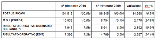 Anche il quarto trimestre dell’esercizio conferma il trend positivo con ricavi delle vendite in aumento a 101,5 milioni di Euro (+16,9% rispetto al quarto trimestre 2009), il Margine Operativo Lordo (EBITDA) in crescita del 24,9% a 10,9 milioni di Euro e l’utile netto quasi raddoppiato a 3,5 milioni di Euro rispetto al quarto trimestre 2009.