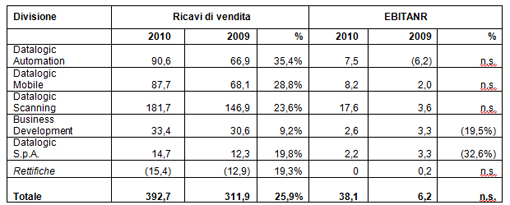 La Divisione Datalogic Automation, specializzata nella produzione di sistemi di identificazione automatica barcode, RFID e visione e che rappresenta il 23% del fatturato consolidato, ha registrato una crescita del 35,4% rispetto al 2009 con un fatturato di 90,6 milioni di Euro (26 milioni di Euro nel quarto trimestre 2010, +40,5% su base annua).