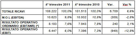 Anche il quarto trimestre dell’esercizio conferma il trend positivo con ricavi delle vendite in aumento a 108,2 milioni di Euro (+6,6% rispetto al quarto trimestre 2010), L’EBITANR in crescita del 3% a 8,2 milioni di Euro e l’utile netto più che raddoppiato a 8,7 milioni di Euro rispetto al quarto trimestre 2010. Il Margine Operativo Lordo (EBITDA) in calo del 2,8% a 10,6 milioni di Euro risente invece dell’impatto dei costi di natura non ricorrente, pari a 1,8 milioni di Euro, relativi alle acquisizioni realizzate nell’ultimo trimestre dell’anno.