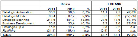 Datalogic Scanning, specializzata nella produzione di lettori di codici a barre fissi per il mercato retail e di lettori manuali e che rappresenta quasi il 50% del fatturato consolidato, è cresciuta del 16,5% con un fatturato di 211,6 milioni di Euro (56,9 milioni di Euro nel quarto trimestre 2011, +31% su base annua). Nell’ambito dei lettori fissi, nel 2011 il Gruppo si conferma come leader incontrastato dei prodotti per il mercato retail. Nell’ambito dei lettori manuali il Gruppo ha ulteriormente consolidato la propria posizione di leader nel mercato europeo e realizzato, nel mercato americano, un’importante crescita trainata dai lettori per applicazioni industriali.