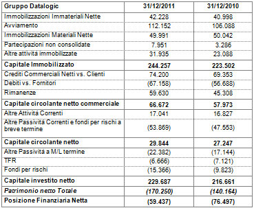• Posizione finanziaria netta negativa in miglioramento a 59,4 milioni di Euro rispetto a 76,5 milioni di Euro al 31 dicembre 2010