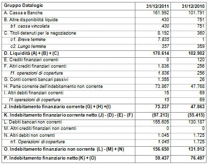 La posizione finanziaria netta al 31 dicembre 2011 evidenzia un ulteriore miglioramento attestandosi a -59,4 milioni di Euro rispetto ai -76,5 milioni di Euro al 31 dicembre 2010, grazie all’elevata generazione di cassa avvenuta nel corso dell’esercizio e nonostante l’acquisizione di PPT Vision avvenuta nel mese di dicembre che ha comportato un esborso pari a 4,1 milioni di Euro. In particolare si evidenzia l’elevata generazione di cash flow operativo pari a 68,5 milioni di Euro derivante dal buon andamento della redditività operativa.