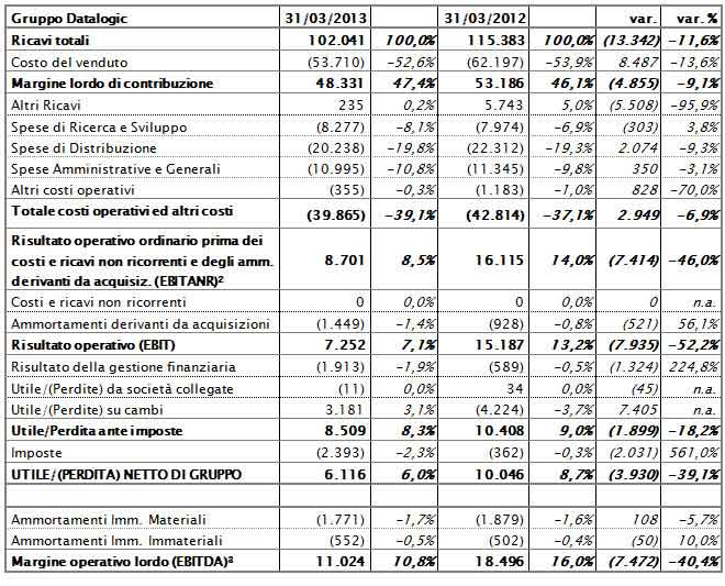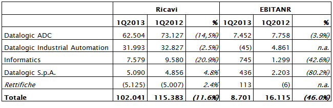 I risultati del primo trimestre 2013, che chiude con un utile netto di 6,1 milioni di Euro rispetto ai 10,0 milioni di Euro del primo trimestre 2012, risentono della debolezza dei mercati di riferimento in particolare nel segmento ADC (Automatic Data Capture) caratterizzato da un forte rallentamento degli investimenti da parte del settore retail.