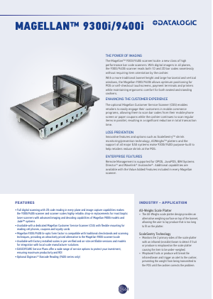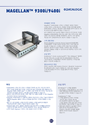 Magellan™ 9400i 스캐너/저울은 새로운 차원의 고성능 바코드 스캐너입니다. 모든 면에서 디지털 이미지 스캐너를 사용하는 9400i 스캐너를 사용하면 출납원이 품목의 방향과 관계없이 1D 및 2D 바코드를 손쉽게 스캔할 수 있습니다.